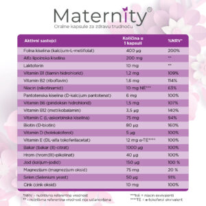 Period trudnoće je posebno stanje u životu svake žene. U ovom osetljivom periodu dolazi do različitih promena u telu žene. Pre same trudnoće, tokom nje, u post-porođajnom periodu i tokom dojenja znatno se povećavaju potrebe za određenim vitaminima i mineralima. Maternity kapsule sadrže čak 19, pažljivo odabranih, prirodnih sastojaka koji sinergistički deluju obezbeđujući savršenu formulaciju i najkompletniju suplementaciju pre, tokom trudnoće i nakon nje.